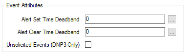 • Alert Set Time Deadband—Use to specify the amount of time that the digital's point state has to have continuously remained in the state defined by the Alert Active State before the alert state quality is indicated as on. If the digital is configured to do so (see Specify the Point Data Class used for DNP3 Communications), a DNP3 event is also generated to report the change of state to the DNP3 controlling station(s).