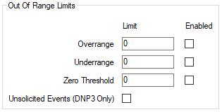 • Unsolicited Events (DNP3 Only)—Select this check box if the SCADAPack x70 device is to transmit the Out of Range events in an unsolicited message.