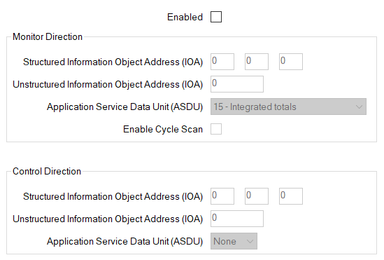 - Enabled—Use the check box to define whether or not to enable interaction between the object on the IEC 60870-5-104 Controlled Station and its associated Controlling Station.