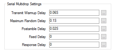 Most of the properties in the Serial Multidrop Settings section are only available when the Port Mode of a Port Function is set to RS232 (RTS) Keyed (see Device Configuration Serial Port Tabs). The Response Delay property is also available when the Port Mode is set to RS485 2 Wire.