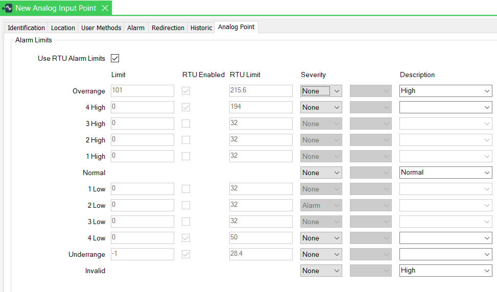 - RTU Alarm Limits: see Define whether a Point uses the RTU Alarm Limits.