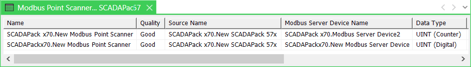 The Modbus Point Scanners List provides a summary of the status of the Modbus Point Scanner to which your User Account and the client provide access. When accessed from a SCADAPack x70 Device Configuration item or a SCADAPack x70 Modbus Server Device, the entries in the list are filtered to only show those SCADAPack x70 Modbus Point Scanners that are associated with that particular SCADAPack x70 Device Configuration item or SCADAPack x70 Modbus Server Device.