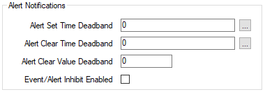 - Alert Clear Value Deadband—Use to specify the amount by which the analog's value has to travel beyond an Alarm Limit, before it is considered to have traveled past that limit. Use this property to help avoid generating excessive alerts (alarms) when a value is fluctuating around an Alarm Limit.