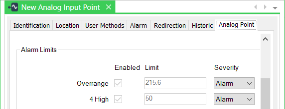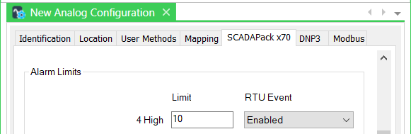 The Limit values in the Alarm Limits section of the Analog Point tab on the SCADAPack x70 DNP3 Analog Point also take into account any Master Station Scaling that is applied. The Multiplier and Offset are applied to the Limit values that the point inherits from the Alarm Limits section on the Form of the SCADAPack x70 Analog Configuration Item with which it is associated (see Configure the SCADAPack x70 Device's Alarm Limits Settings). For example, if the 4 High Limit value on the Form of the SCADAPack x70 Analog Configuration item is 10° Celsius, this gets scaled to 50° Fahrenheit for the 4 High Limit value on the Form of the SCADAPack x70 DNP3 Analog Point with which the Analog Configuration Item is associated.