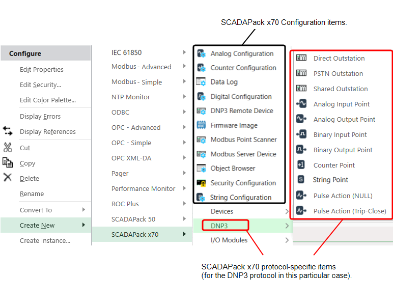 • A SCADAPack x70 Configuration item for the configuration that is specific to a particular SCADAPack x70 device, input or output.