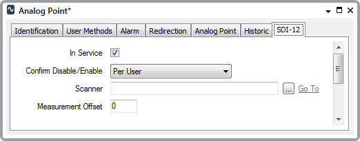Use the fields at the top of the SDI-12 tab to configure the SDI-12 specific point properties. Some of these properties are common to points on many simple drivers—for information, see Configure Common Point Properties in the Geo SCADA Expert Guide to Simple Drivers. Properties that are specific to analog points on the SDI-12 driver are explained below.