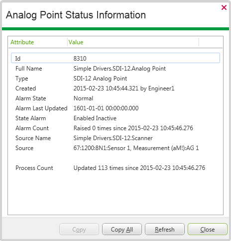 Every item in the Geo SCADA Expert database has its own Status display (also referred to as a View window or View dialog). You view an item's Status display by selecting that item's View Status pick action or menu option. The Status display provides information about the status of the selected item, presenting the information in the form of 'status attributes'. For further information about working with Status displays, see Status Displays.