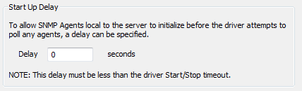 A Start up delay is required when monitoring SNMP values locally at the server (for example, disk space, or power supply). In such cases, a delay should be specified to allow the SNMP agents to start up before the driver polls them for data.