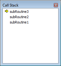 The Call Stack window indicates the execution path by displaying the stack frames associated with the current execution location. A yellow arrow indicates the frame that contains the current execution location.