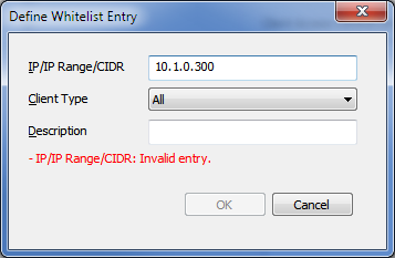 • CIDR—Use the Classless Inter-Domain Routing notation to enter a range of IP addresses. CIDR notation is a compact representation of an IP address and its associated routing prefix. The IP address is expressed according to the standards of IPv4. It is followed by a separator ('/') character and the prefix size is expressed as a decimal number. You can also configure and use the IPv6 standards if your clients communicate using this protocol (see Enable or Disable IPv6 on the Client).