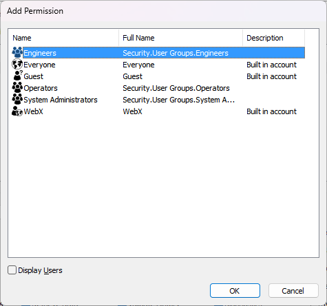 When you display the Add Permission window, the Guest user and WebX user are listed automatically. These are Built-In User Accounts. The Guest user is for ViewX users and third-party applications that access the database without logging on. The WebX user is for users who access the database from Original WebX without logging on.