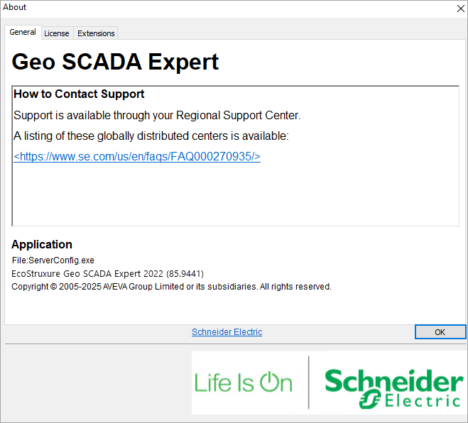 The About dialog box contains contact details for Technical Support and Application information. You can find the contact details of the technical support team for your location at: https://www.se.com/us/en/faqs/FAQ000270935/
