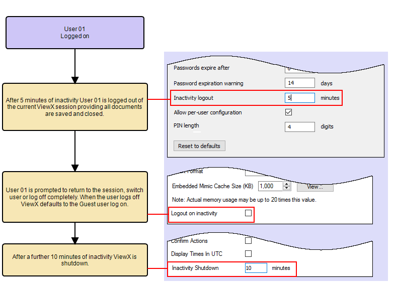 The way in which the Inactivity Shutdown settings affect ViewX depends on the settings of the Inactivity logout and the Logout on inactivity: