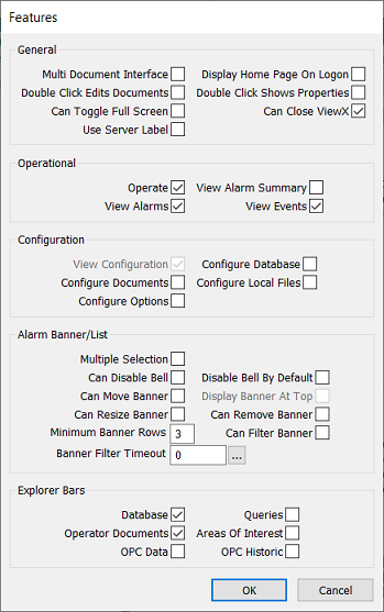 Use the Features window to define which features are available to the Guest User. The settings on the Features window work in the same way as the corresponding settings on the User Form except that they apply to the Guest user account and so can be used by anybody that has access to the client.
