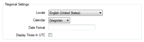 The regional settings determine which language, time format, date format and calendar are used when displaying information to the user. The regional settings are on a per user basis and are configured on the User Form.
