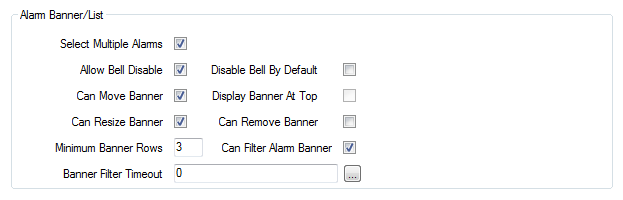 Can Resize BannerSelect this check box to allow the user of the account to alter the dimensions of the Alarm Banner. If you clear the check box, the Alarm Banner is shown at a set size when the user is logged on.