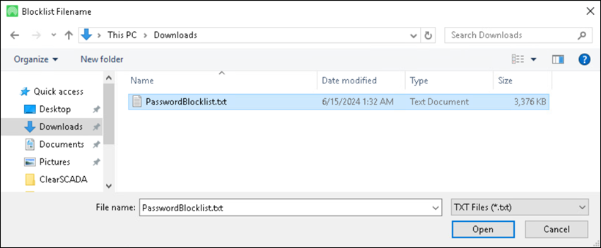 When you have created a Password Blocklist item you need to import the source blocklist text file that you created to make it available to Geo SCADA Expert.