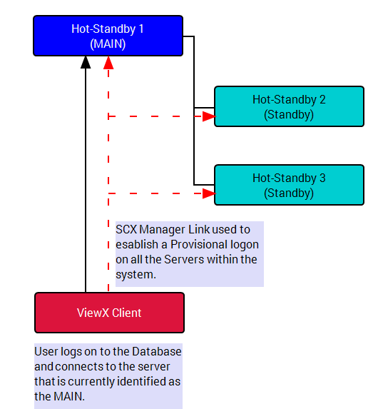 The following example illustrates the sequence of events for a Triple-Hot Standby System, but this applies equally to a Hot-Standby Pair. In this example, the Server Hot-Standby 1 initially assumes the role of ‘MAIN’, as a user you connect to the ‘MAIN’ server using a ViewX client (it is assumed that all the correct permissions have been configured).