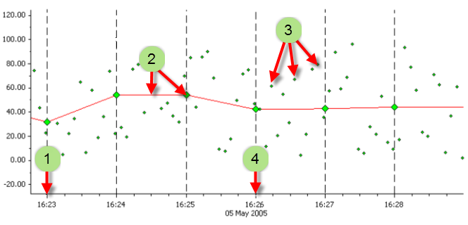 To calculate the historic value, Geo SCADA Expert uses a sample. The sample is a set of values that are reported during a defined time. For example, to calculate the hourly average, Geo SCADA Expert uses a sample of values that were reported during an hour period.