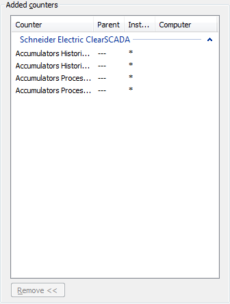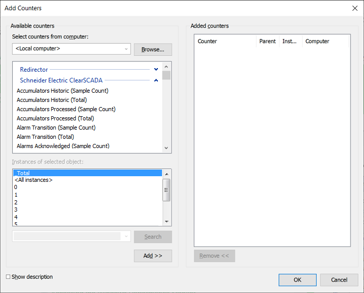 • To select all the counters, click the Schneider Electric Geo SCADA Expert category and select the Add button.