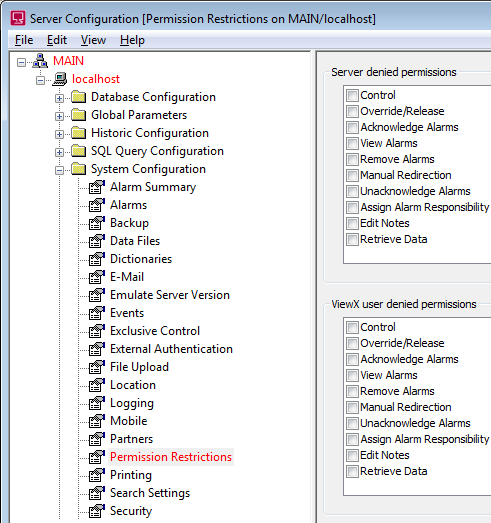 When you change any settings using the Geo SCADA Expert Server Configuration Tool, the affected components are highlighted in red in the tree-structure: