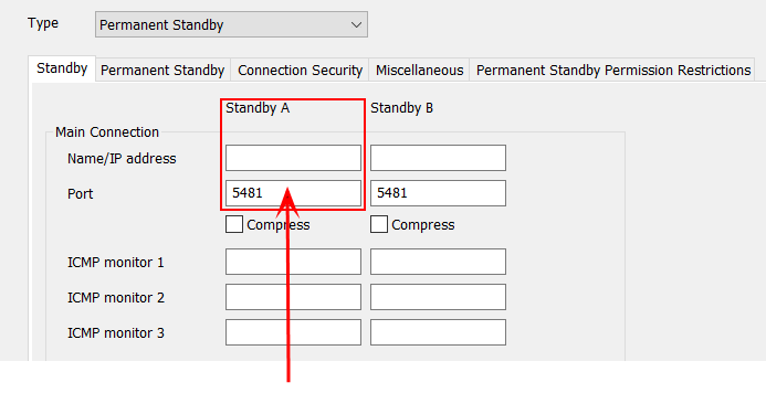 - In the Main Connection section on the Standby tab, use the Standby A fields to define the settings for the primary connection between the Permanent Standby server and the server that starts as the Main server in the architecture.