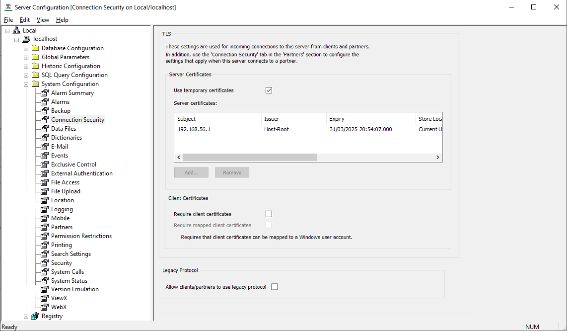 You use the Connection Security section of the Geo SCADA Expert Server Configuration Tool to set up the server's certificate settings for communications with the other servers and clients on your system. The Connection Security section is located within the System Configuration branch of the tool. We strongly recommend that you set up your system to use trusted certificates to initiate secure connections and encrypt the data that is transmitted between the Geo SCADA Expert servers and clients. For more information about the use of certificates and also about the configuration settings that are required for client certificates, see Certificates for Geo SCADA Expert Server and Client Connections.