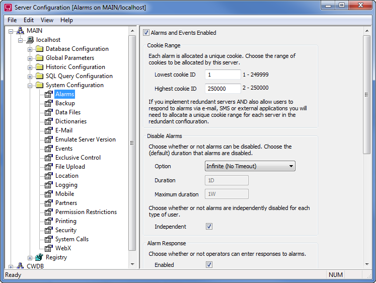 • In the Highest Cookie ID field, enter the highest number that the server can allocate to an alarm. This number defines the end of the cookie range for the server you are configuring.