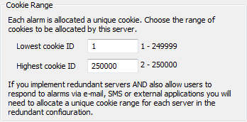 • In the Lowest Cookie ID field, enter the lowest number that the server can allocate to an alarm. This number defines the start of the cookie range for the server you are configuring.