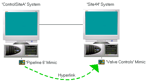 The 'Pipeline 6' Mimic is configured to contain a hyperlink to a Mimic named 'Valve Controls' on another system called 'Site44'.