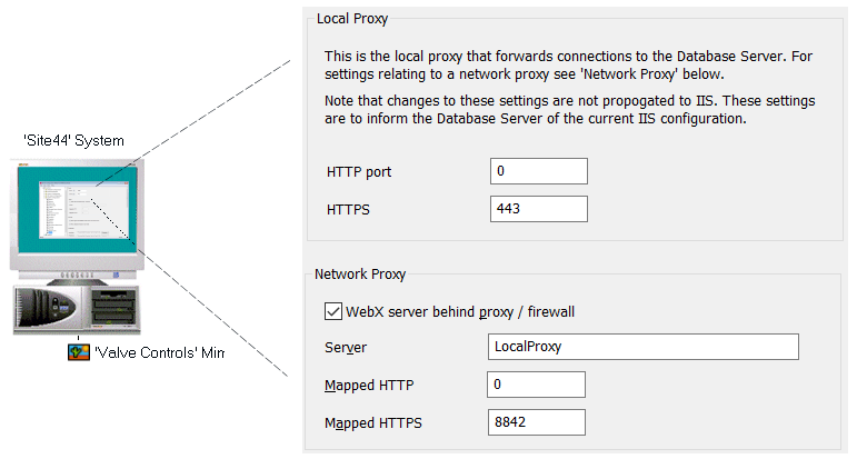 - HTTPS Port—Enter the number of the secure web server port (XML) used by the ‘target’ system. This typically has to match the number configured in the HTTPS port field in the Local Proxy section of the WebX settings for the ‘target’ system (see Define the Local Proxy Settings for the Original WebX Server). The exception to this is if your system uses a proxy server or proxy firewall for communications between the Original WebX server and Original WebX clients (see Define the Network Proxy Settings for the Original WebX Server) and the Original WebX clients communicate with Geo SCADA Expert via the proxy. With such a setup, you typically specify the secure port on the proxy server that maps through to the Original WebX server port - that is, the proxy port number that matches the Mapped HTTPS Port configured in the WebX Proxy settings for the 'target' system (see Define the Network Proxy Settings for the Original WebX Server).