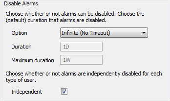 - Enter the longest amount of time for which the alarms can be disabled in the Maximum Duration field. This setting is only available when the Option combo box is set to Variable Duration.