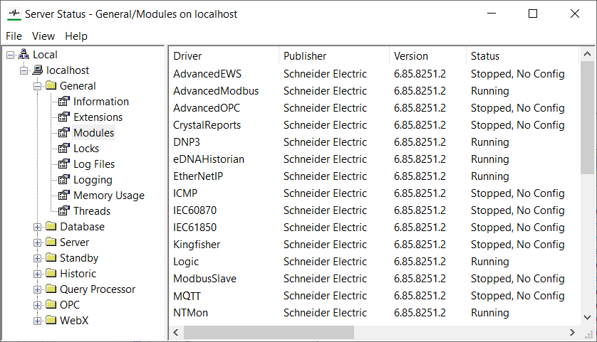 The Modules section lists the Geo SCADA Expert drivers (some of which might not be installed on your system).