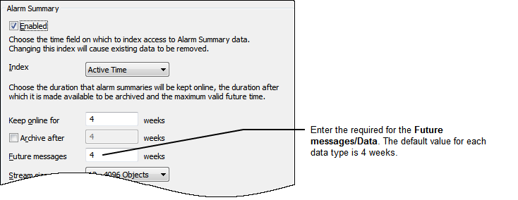 4. Enter the amount of time (in weeks) for the future life in the Future Messages/Data field. Any data that has a time stamp that is before the expiry of the future data time will be stored historically. Event data that has a time stamp beyond the future data limit will not be stored historically.