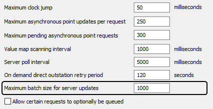 You can use the Maximum Batch Size for Server Updates setting to define the size limit for batched driver updates. By default, the limit is 1000 which is appropriate for many large systems (systems with around 400-500 channels).