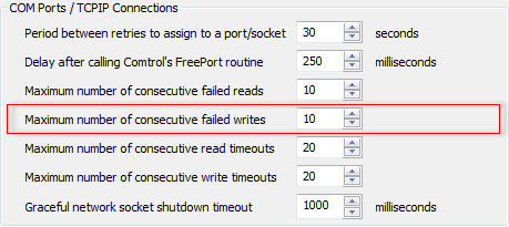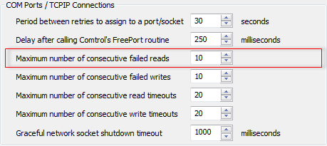 If you raise the Maximum number of consecutive failed reads setting too high, the driver will take longer to recognize a COM port as having failed.