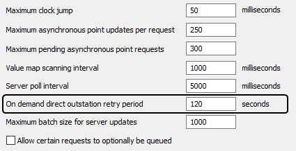 A driver will only use the On Demand Direct Outstation Retry Period setting when the outstation it is communicating with is configured as On Demand and has PSTN fallback.