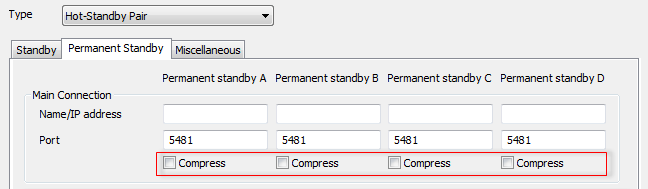 To enable compression, simply select the relevant Compress check box; to disable compression, clear the relevant Compress check box. For example, if you are configuring a Standby server that is part of a Hot-Standby pair architecture and you want to enable compression on the primary connection to the Main server, select the Compress check box in the Standby A column. This instructs Geo SCADA Expert to compress the data transactions between the Standby server you are configuring and the Main server in the Hot-Standby Pair (when the servers are communicating via the primary connection).