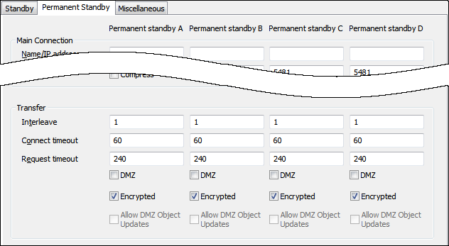 You can configure the Transfer settings for connections to Permanent Standby serverson the Permanent Standby tab in columns representing each Permanent Standby (Permanent Standby A, Permanent Standby B, Permanent Standby C, and Permanent Standby D).