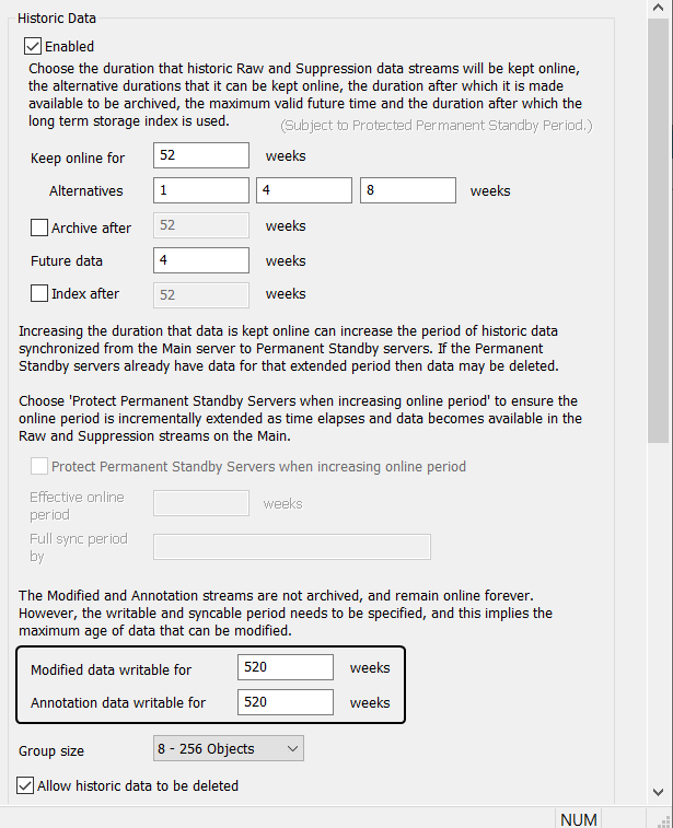 By default, each server is set to allow modified historic data and annotations to be writable and synced for 520 weeks (10 years). For many systems, this setting is appropriate. However, you may choose to extend the number of weeks if your system is expected to continue running for over 10 years. Extending the number of weeks will mean that the modified historic data and annotations can be modified and synced for a longer time. Increasing the syncable period affects the initial synchronization time of standby servers, and although the few data changes made need to be synchronized, the data for the whole period is checked during the initial synchronization. The extra demand, resulting from a longer period, on the resources of the server is negligible and is unlikely to affect the overall system performance.