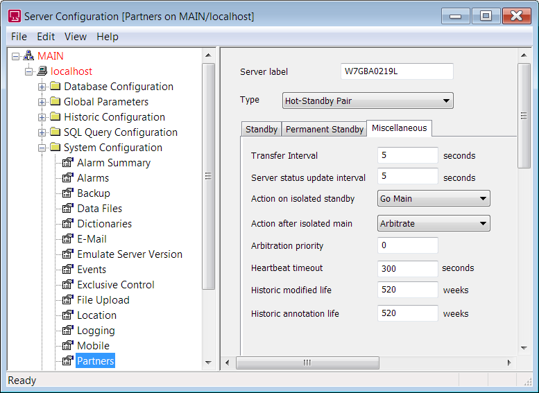 To specify how a server should behave if it becomes isolated, you use the Server Configuration Tool (see Accessing the Geo SCADA Expert Server Configuration Tool). Select the System Configuration folder, then select Partners and then select the Miscellaneous tab.