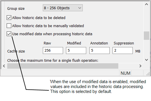 - Select the Use modified data when processing historic data check box to include modified values in the historic data processing. The Use modified data when processing historic data check box is selected by default.