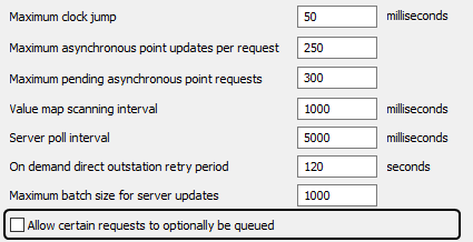 You can use the Server Configuration Tool’s Allow Certain Requests to Optionally be Queued setting to control the availability of the Queue parameter on certain types of request. The Queue parameter is designed for use with PSTN outstations and Direct ‘On Demand’ outstations and allows users to postpone various types of request, including controls, Off Scan, On Scan, Configuration Download, and Tune Alarm Limits.
