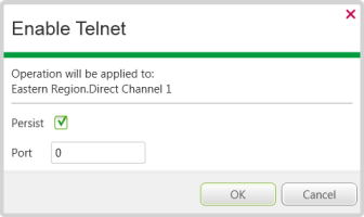 - Clear the Persist check box to temporarily run the Telnet server for the channel—the Telnet server will start running but will stop when the driver or system is shutdown and restarted, or there is a server changeover.