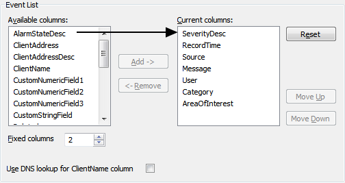 - Change the order of the columns on the Events List by selecting a column in the Current Columns list and then selecting the Move Up or Move Down button. The top column is shown on the left of the Events List and the bottom column is shown on the right, with the other columns being shown in order from left to right.