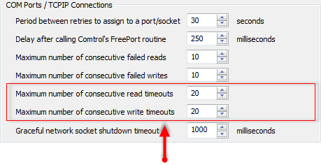 The Maximum Number of Consecutive Read Timeouts and Maximum Number of Consecutive Write Timeouts settings are shown in the COM Ports/TCPIP Connections section of the Channels settings.