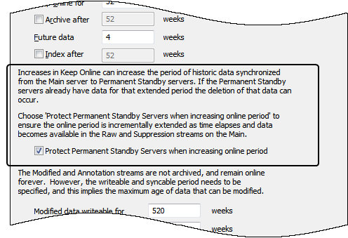 The Protect the Permanent Standby Servers when increasing online checkbox is selected by default. This setting protects any data on Permanent Standby servers that overlaps when you increase the period of historic data that is synchronized from the Main server to the Permanent Standby servers.