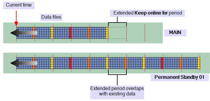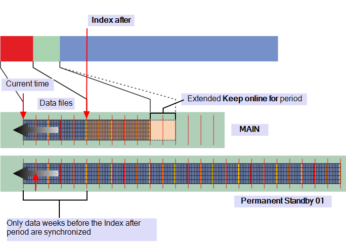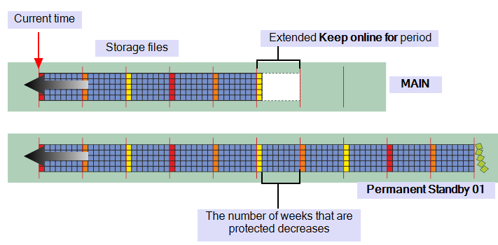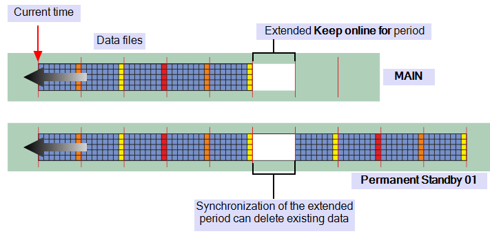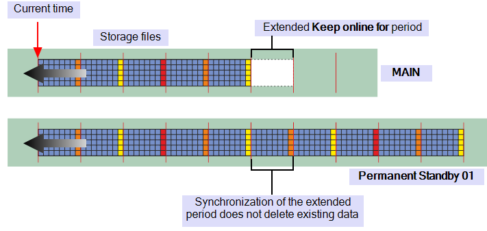 The Keep online for period is 80 weeks on the Permanent Standby 01, but only 28 weeks of synchronized data exist. The extension of the period on the MAIN server does not overlap with any data on the Permanent Standby 01. The data between the servers remains in sync and no data is lost.