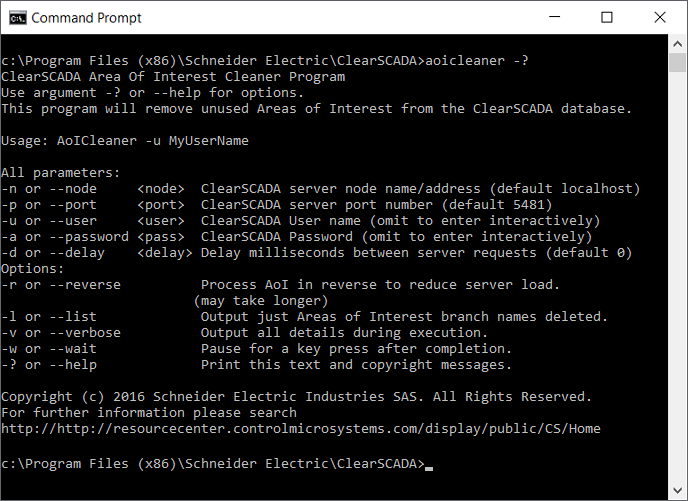 cdcommand to change the directory to the one in which the Area of Interest Cleaner utility, AOICleaner.exe, is located. The utility is installed in the same directory as other Geo SCADA Expert installation files. The default location of the files varies depending on the Windows operating system (see File Locations (Default) in the Geo SCADA Expert Installation Guide).If the utility is installed at the default location on a client PC that is running a 64-bit version of Windows 10, you would enter: