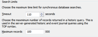 As with many of the other historic settings, the default settings for search limits are suitable for many systems. However, you may need to change the settings if you are experiencing slow responses to historic searches or other processes are 'freezing' during a historic search.